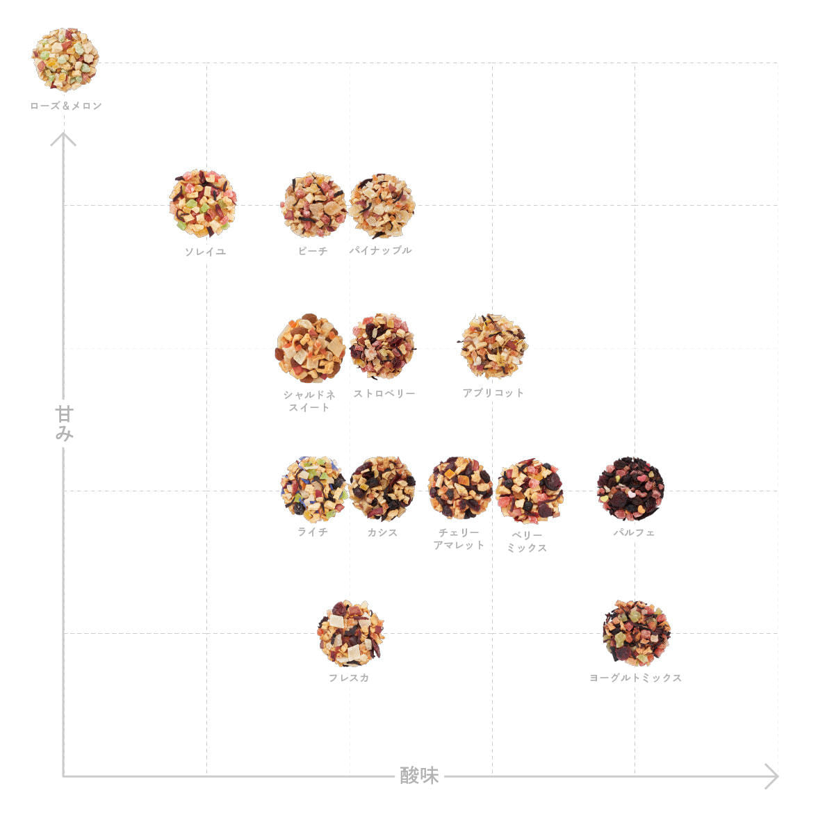 加糖ドライストロベリー(タイ製造)、有機ドライアップル、加糖ドライクランベリー、加糖ドライパパイヤ、加糖ドライマンゴー、有機ハイビスカス/香料、クエン酸、保存料(亜硫酸塩)、着色料(赤40)