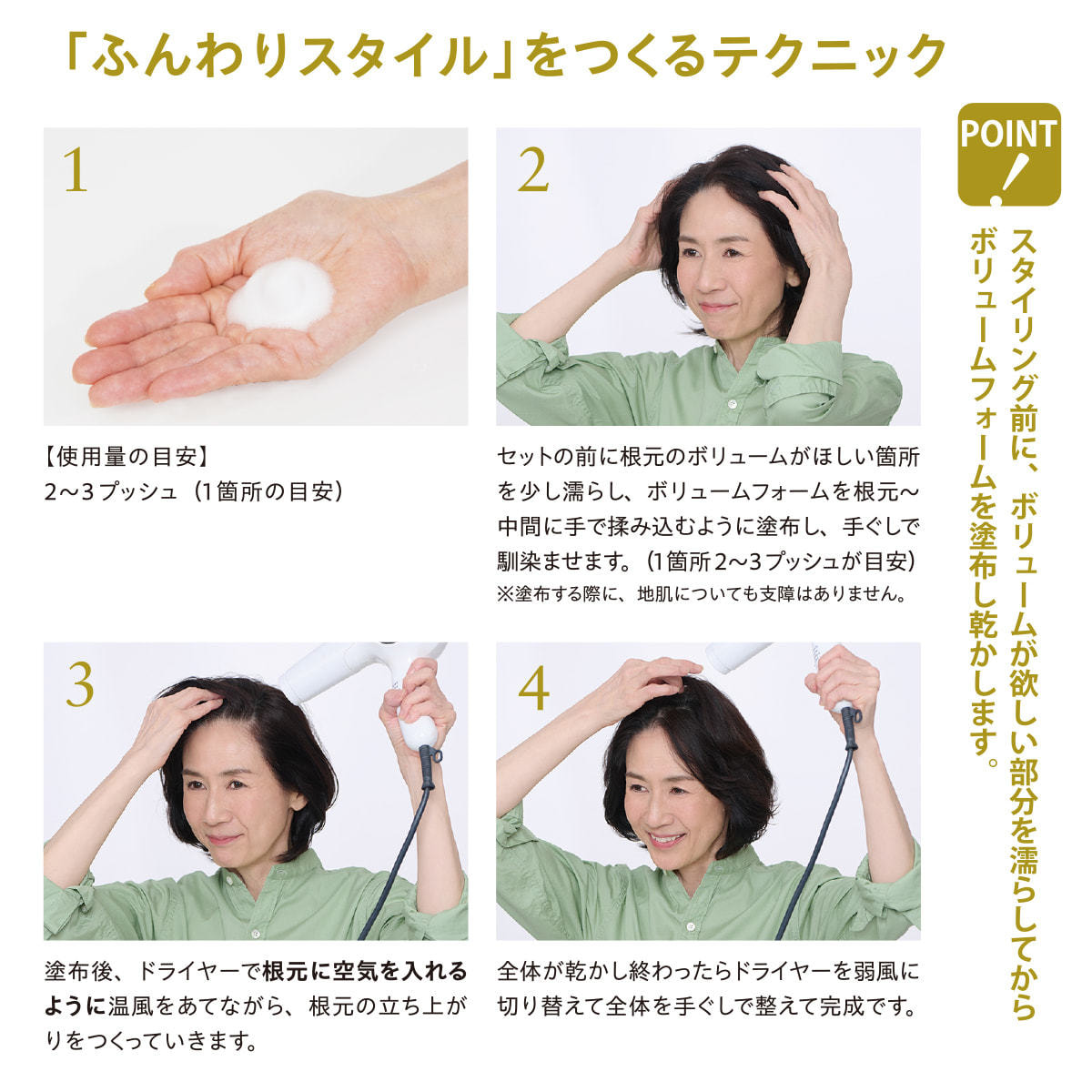 ①セット前に根元のボリュームがほしい箇所を少し濡らし、ボリュームフォームを根元~中間に手で揉み込むように塗布し、手ぐしで馴染ませます。(1箇所2~3プッシュが目安)